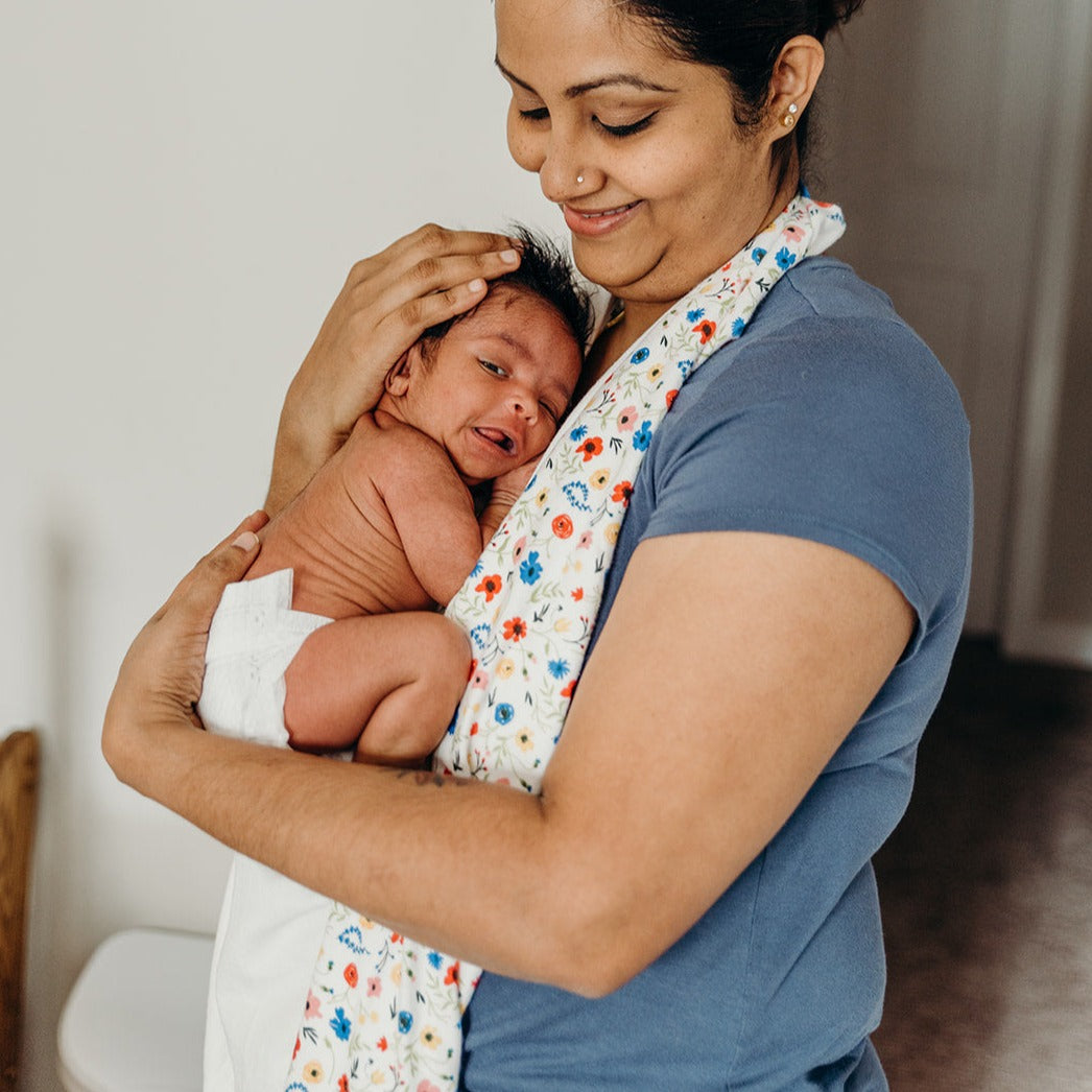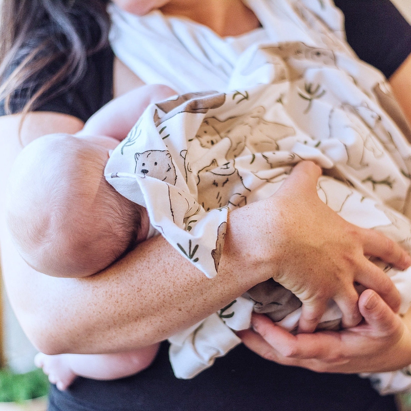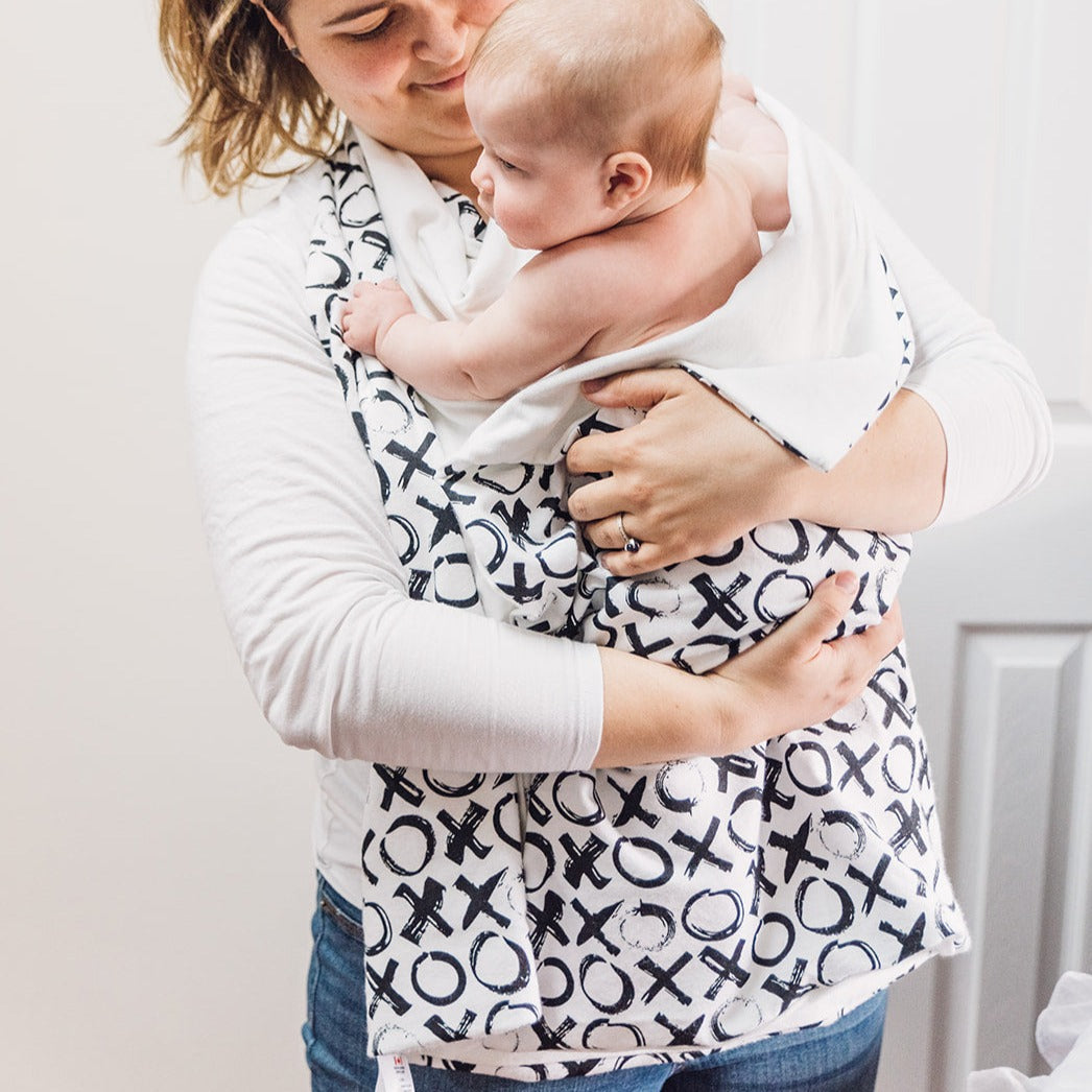 Loop and button your towel around your neck. Vertical for a newborn, Horizontal for an infant. When you are all finished, pick baby up with two hands and cuddle them into your chest. Wrap the towel around them and share the love of togetherness.